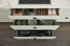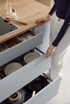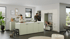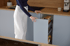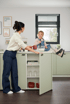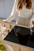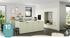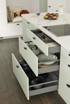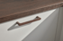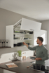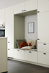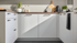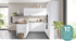 Fronten und Korpus in Alpinweiß bilden einen klaren, hellen Rahmen und werden durch Regalboard, Arbeitsplatten und Ansetztheke in Walnuss Natur Nachbildung warm ergänzt.
